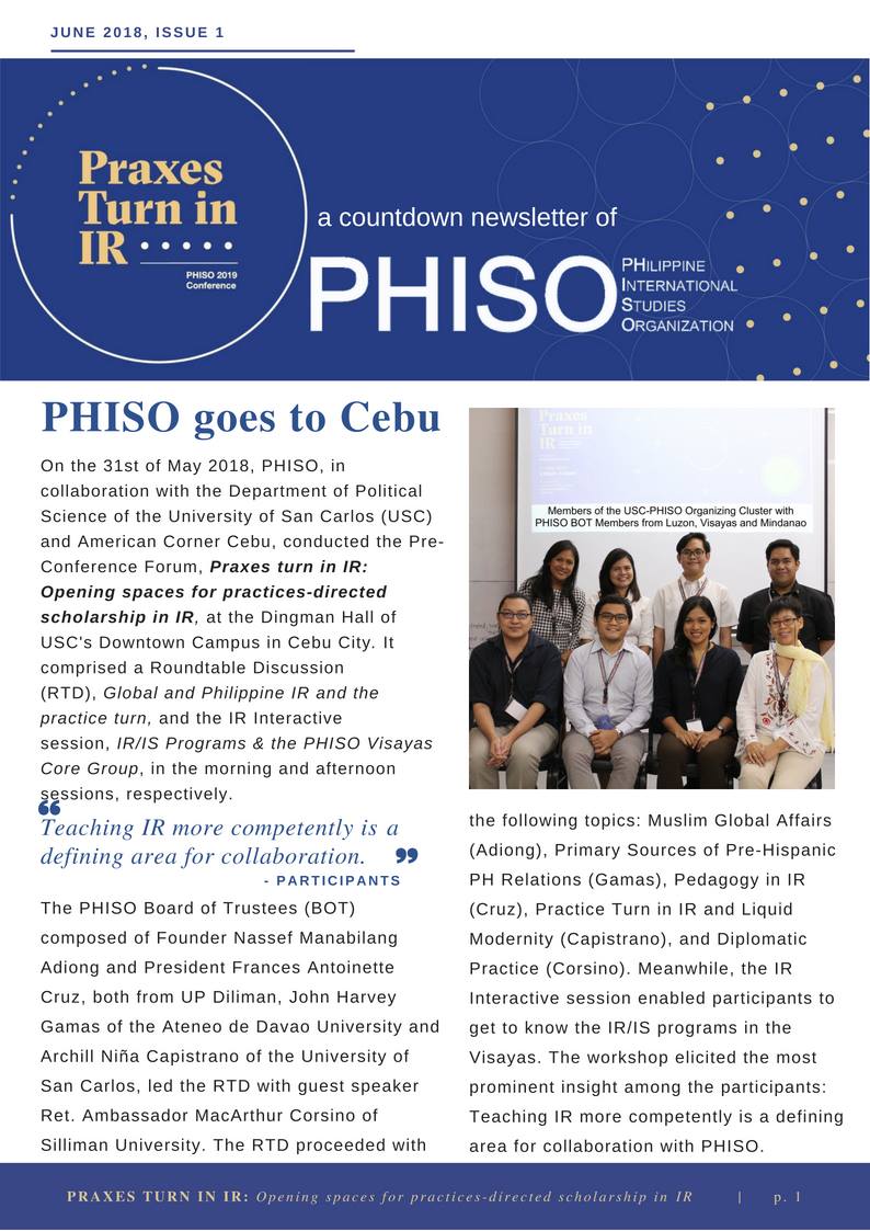 On the 31st of May 2018, PHISO, in collaboration with the Department of Political Science of the University of San Carlos (USC) and American Corner Cebu, conducted the Pre-Conference Forum, Praxes turn in IR: Opening spaces for practice-directed scholarship in IR, at the Dingman Hall of USC’s Downtown Campus in Cebu City. It comprised a roundtable discussion, Global and Philippine IR and the practice turn, and the IR interactive session, IR/IS Programs & the PHISO Visayas Core Group, in the morning and afternoon sessions, respectively.