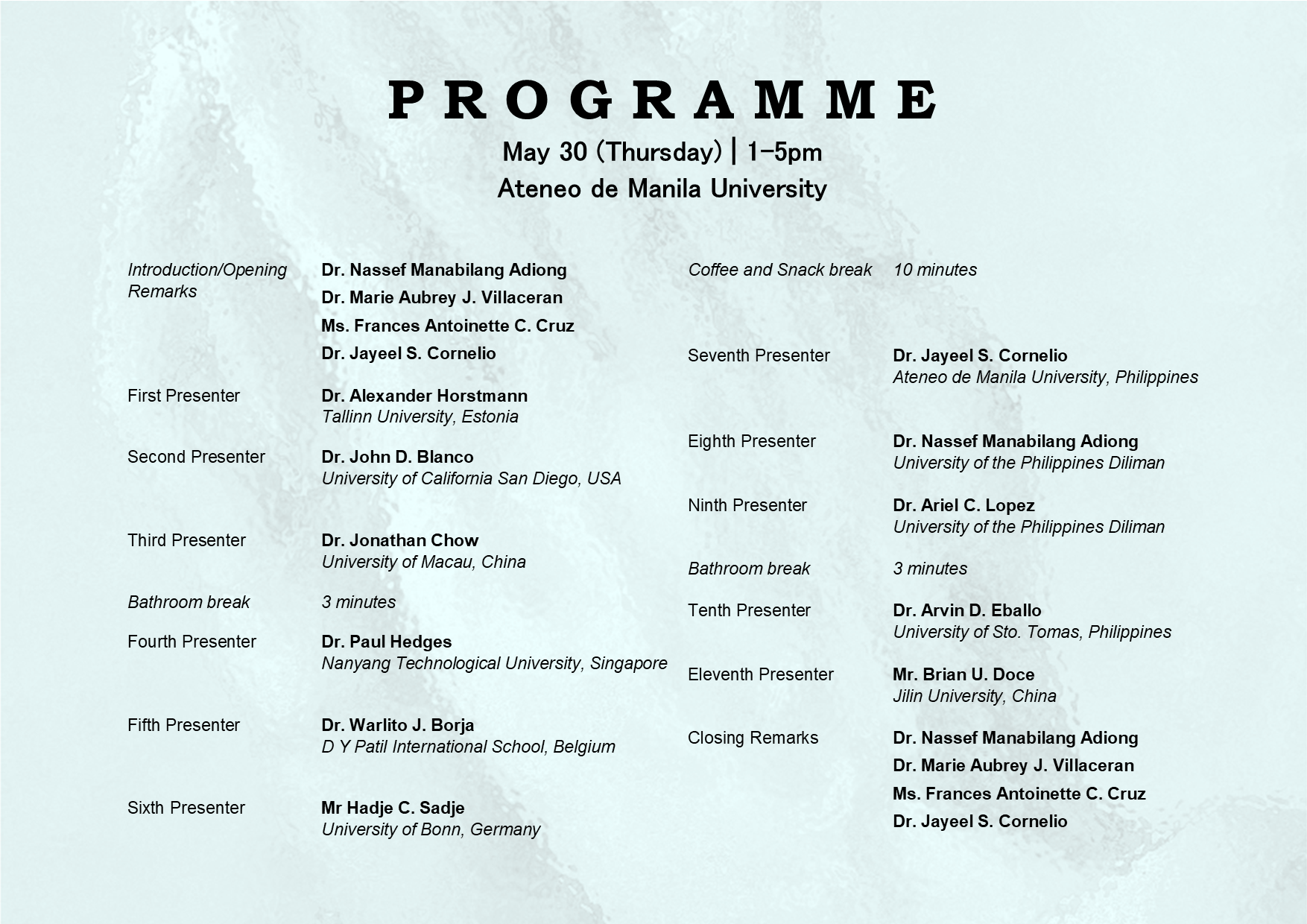 Organized by the Decolonial Studies Program on Religion, University of the Philippines Center for Integrative and Development Studies (UP CIDS-DSPr). Hosted by the Development Studies Program, Ateneo de Manila University, and in collaboration with the Philippine International Studies Organization (PHISO).