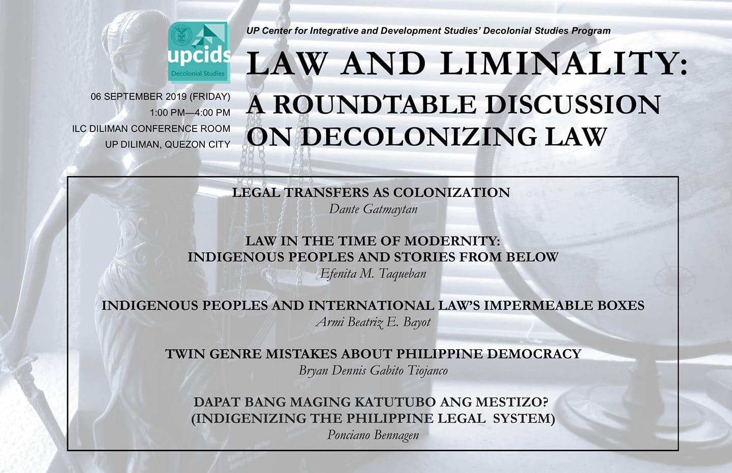 The UP-CIDS Decolonial Studies Program presents “Law and Liminality: A Roundtable Discussion on Decolonizing Law” on September 6, Friday, 1pm, at UP Diliman’s Interactive Learning Center’s conference room. Led by the constitutionalist scholar, Professor Dante Gatmaytan.