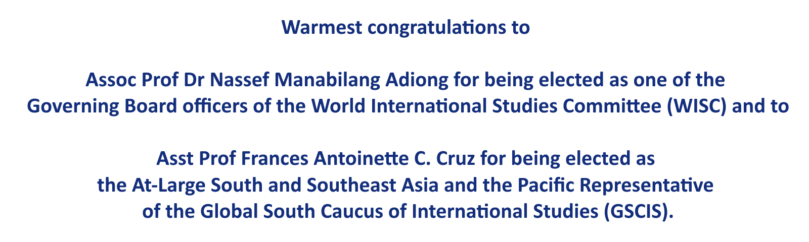 Asst Prof Frances Antoinette C. Cruz for being elected as the At-Large South and Southeast Asia and the Pacific Representative of the Global South Caucus of International Studies (GSCIS).