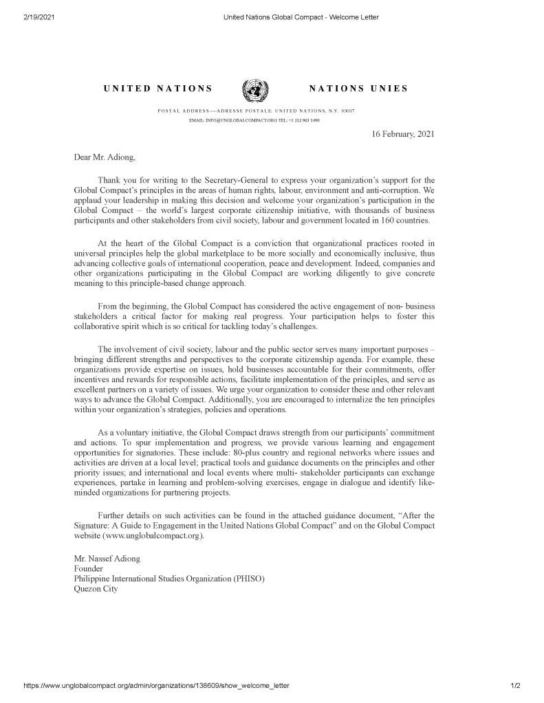 With the upcoming #PHISO2021 Free Virtual International Conference on Global Anthropocene, it is very fitting to announce to our dearest members that on February 16, 2021 we successfully registered as participant of the United Nations Global Compact. As a participant, PHISO commits to: