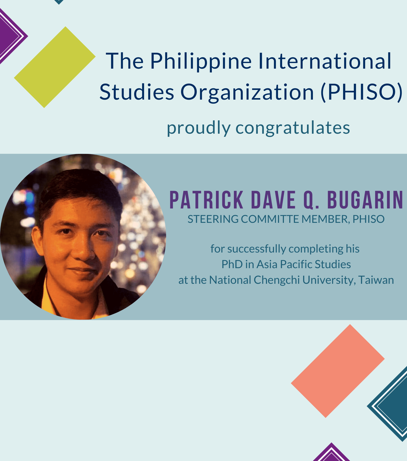 PHISO proudly congratulates Patrick Dave Q. Bugarin for successfully completing his PhD in Asia Pacific Studies at the National Chengchi University, Taiwan. Patrick: “PHISO provided me with several opportunities to build on my research. Its wide network of established and rising scholars continue to… Continue Reading “Congratulations, Patrick Dave Q. Bugarin”