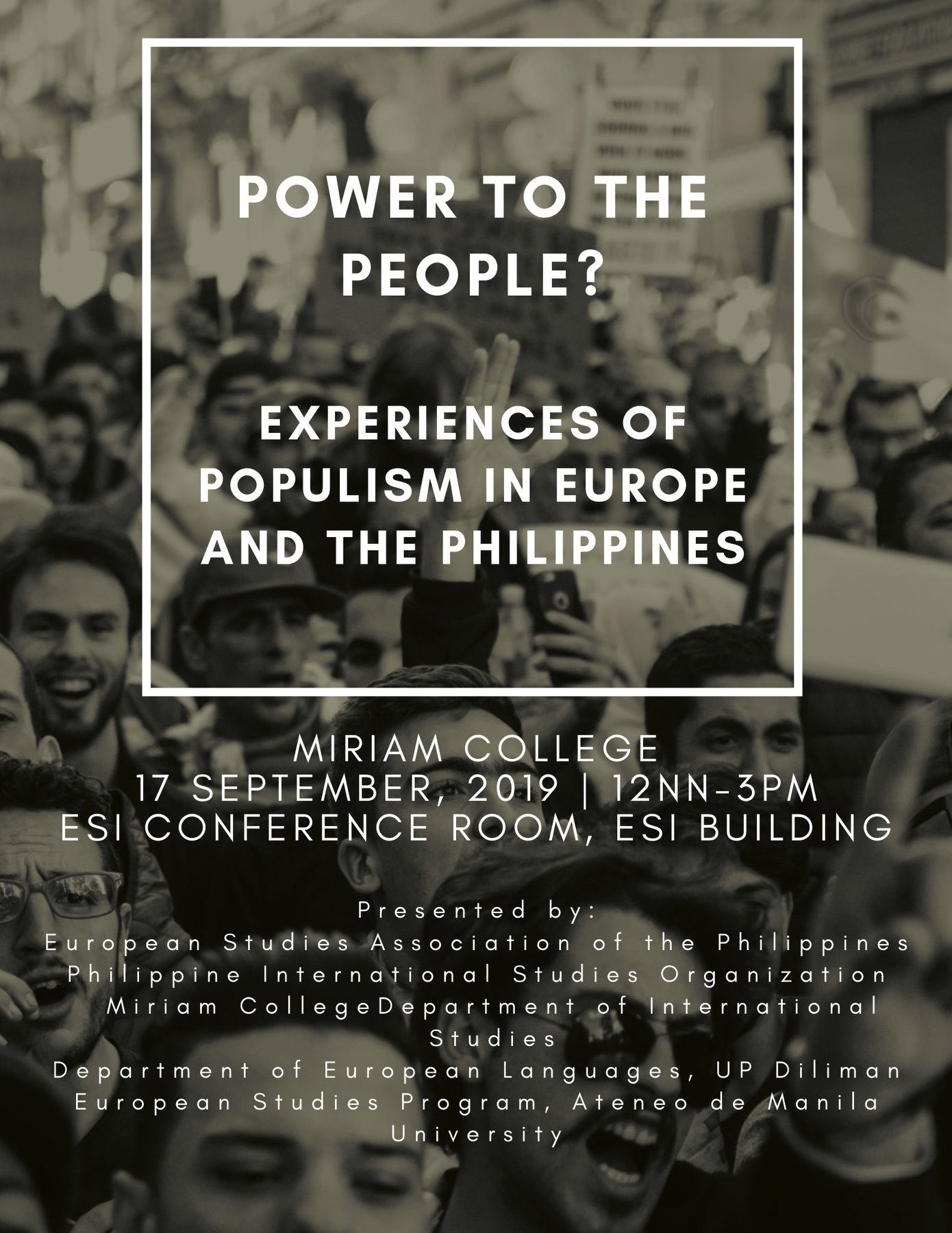 Join PHISO and the European Studies Association of the Philippines (ESAP) for the first two stops of our roundtable caravan on populism in Europe and the Philippines! The event will feature different speakers and perspectives per venue. First stop: Miriam College ESI Conference Room,… Continue Reading “Power to the People? Experiences of Populism in Europe and the Philippines”